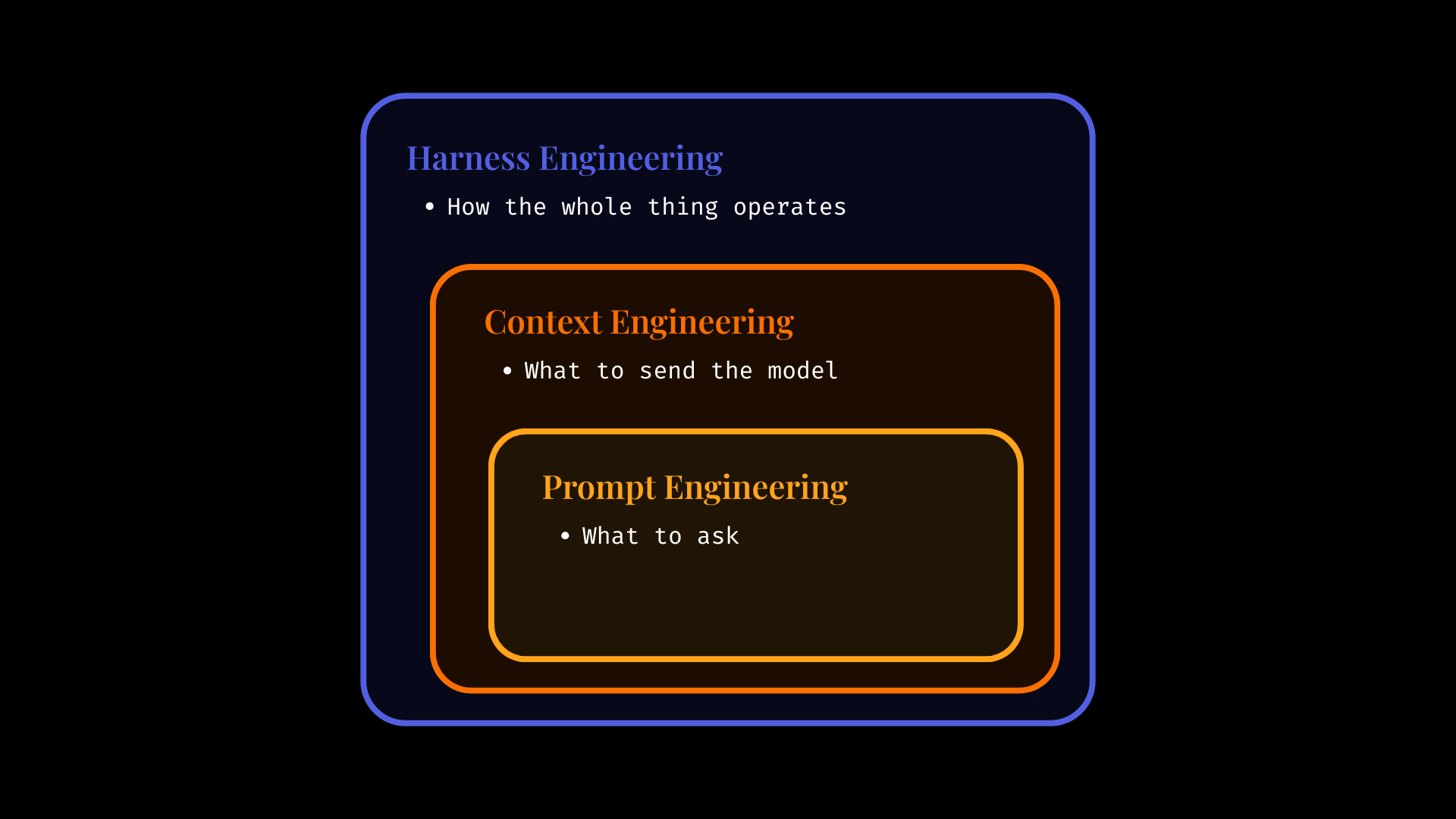 The clearest way to understand the difference between prompt engineering, context engineering, and harnesses