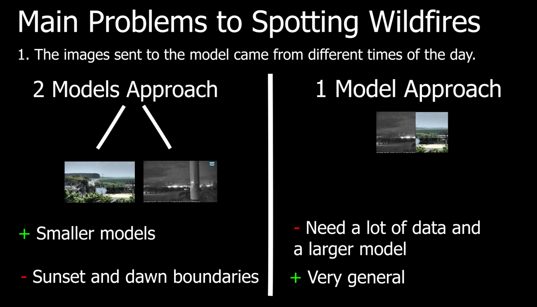 The main problems they had to face are that 1. the images sent to the model came from different times of the day. Meaning that not only the luminosity will be different between day and night, which is a massive factor for a model since it affects and changes the whole image giving it a hard time to understand what's going on, but also that day fires are easily detected through the smoke. In contrast, night fires are much more easily detected through live fire, due to obvious reasons. To attack this issue, teams either could build two separate models, one for the night and one for the day or build one larger model and assume that the smoke is also detectable during nighttime.