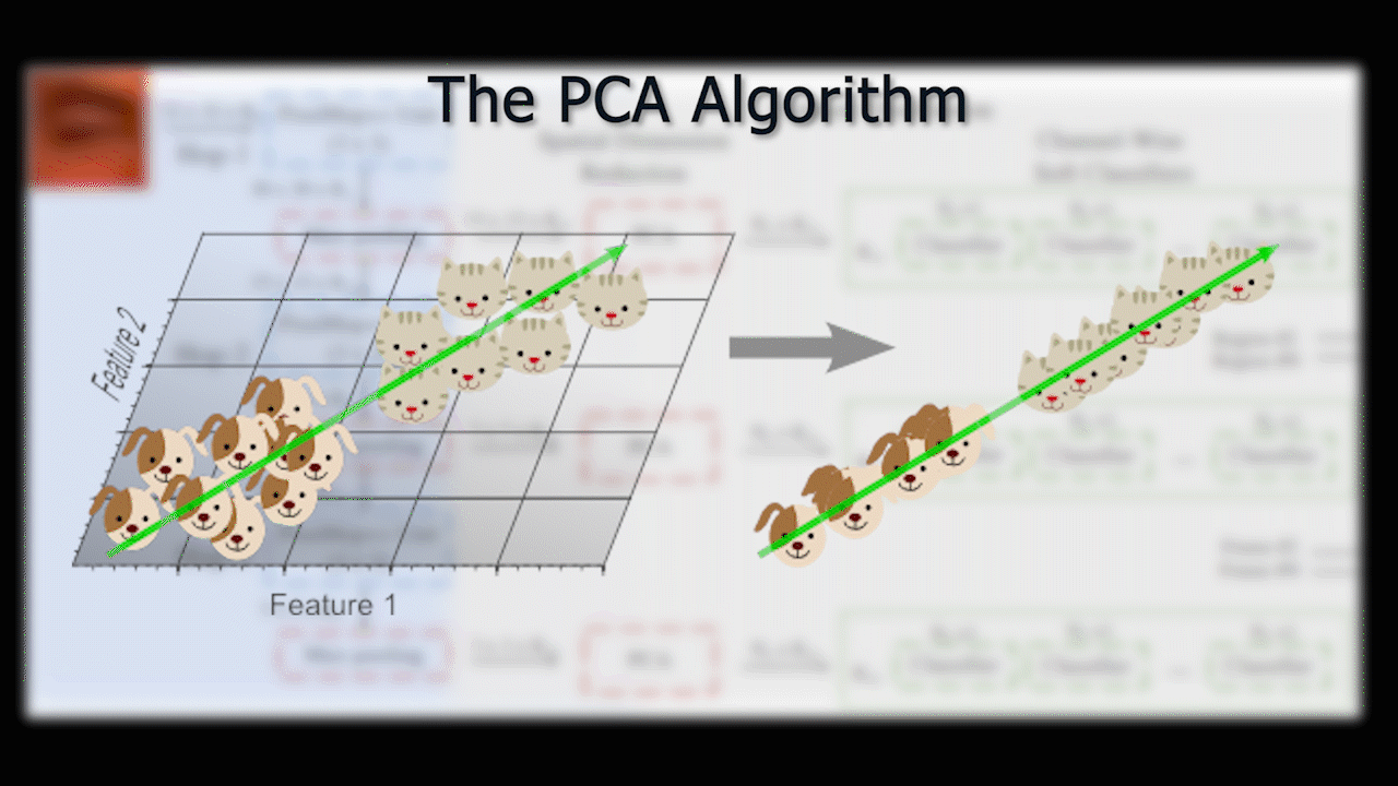 Here is a very simple example of how PCA can reduce the dimension, where two-dimensional points of cats and dogs are reduced to one dimension on a line, allowing us to add a threshold and easily build a classifier. Each hop gives us respectively 45, 30, and 5 parameters per channel instead of having images of size 15 by 15, 7 by 7, and 3 by 3, which would give us in the same order 225, 49, and 9 parameters. This is a much more compact representation while maximizing the quality of information it contains. All these steps were used to compress the information and make the network super fast.