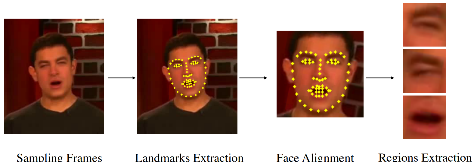 At first, they use another model to extract 68 different facial landmarks from each video frame. These 68 points are extracted to understand where the face is, recenter, orient and resize it to make them more consistent, and then extract specific parts of the face from the image. These are the "patches" of the image we will send our network, containing specific individual face features like the eyes, mouth, nose. It is done using another model called OpenFace 2.0. It can accurately perform facial landmark detection, head pose estimation, facial action unit recognition, and eye-gaze estimation in real-time. These are all tiny patches of 32 by 32 that will all be sent into the actual network one by one. This makes the model super efficient because it deals with only a handful of tiny images instead of the full image. More details about OpenFace2.0 can be found in the references below if you are curious about it.